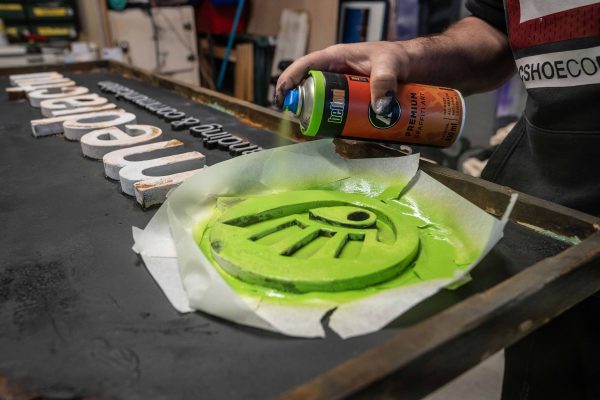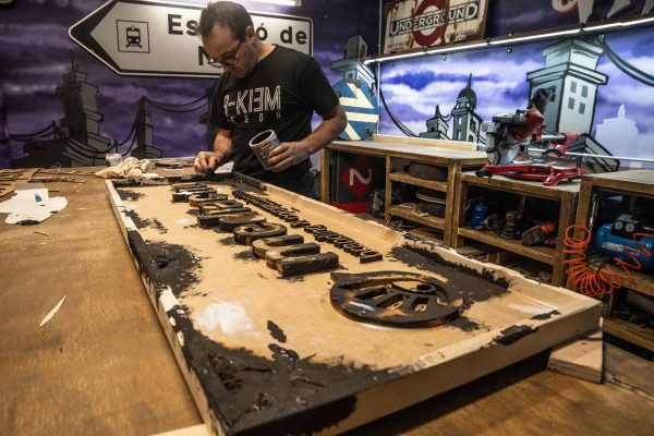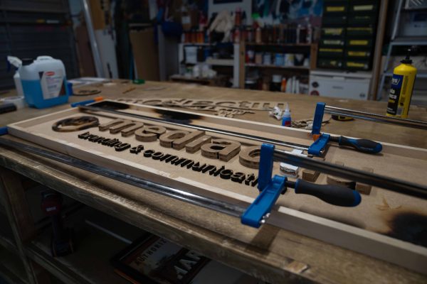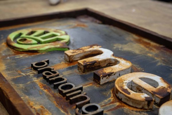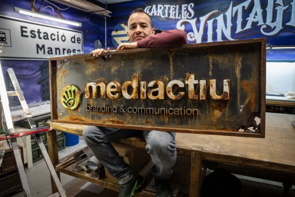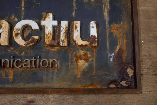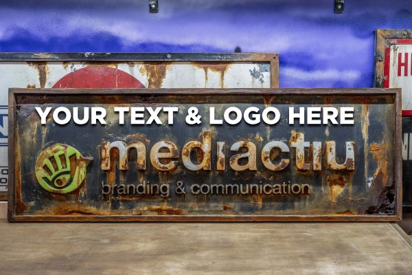 Este cartel realizado integramente en madera con efectos oxidados y deterioro por el paso del tiempo imitando con un resultado muy óptimo el hierro, es una pieza perfecta para decorar tu negocio con tu nombre y tu logo de una manera muy diferente, personal y 100% vintage. Letras corporeas 2cm grosor, logo + slogan 1 cm grosor, Medida cuadro 120x46x3 cm.