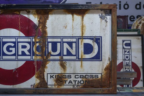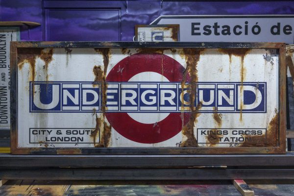 Este cartel está basado aproximadamente en 1910 sobre varias señales originales del famoso sistema de metro UNDERGROUND (The TUBE) en especial de la estación de metro KING’S Cross de Londres.